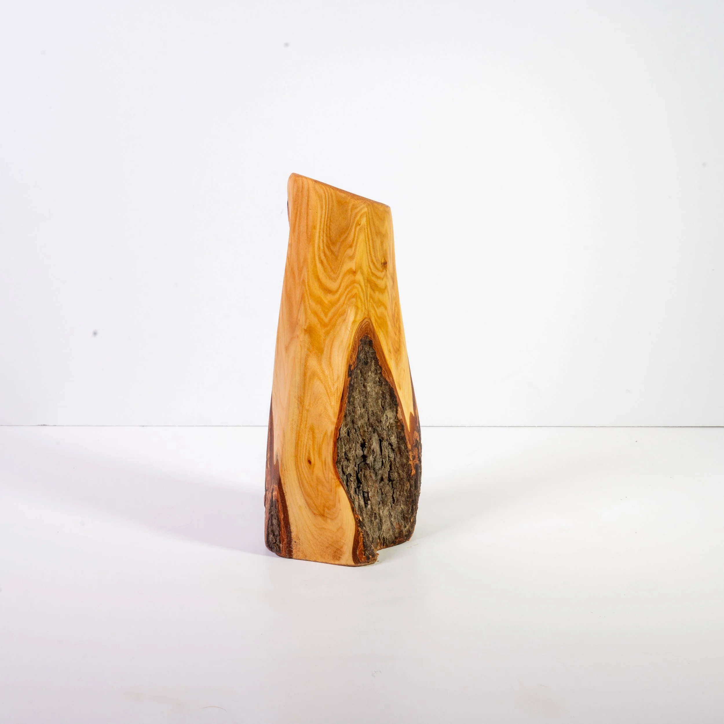 Harvested from riverbank deadfall along the Assiniboine, this vase is part of an ongoing conversation with nature. Small vases meant for dried flowers. The bark carves deeper than I ever could. Its gnarled valleys and smooth golden ridges are a reminder that beauty doesn’t need to be coaxed… it’s already there, waiting. My role is simply to listen, reveal, and try not to mess it up. The contrast between raw bark and polished grain speaks to effort and grace, wildness and craft. A piece that’s as much homage as object.